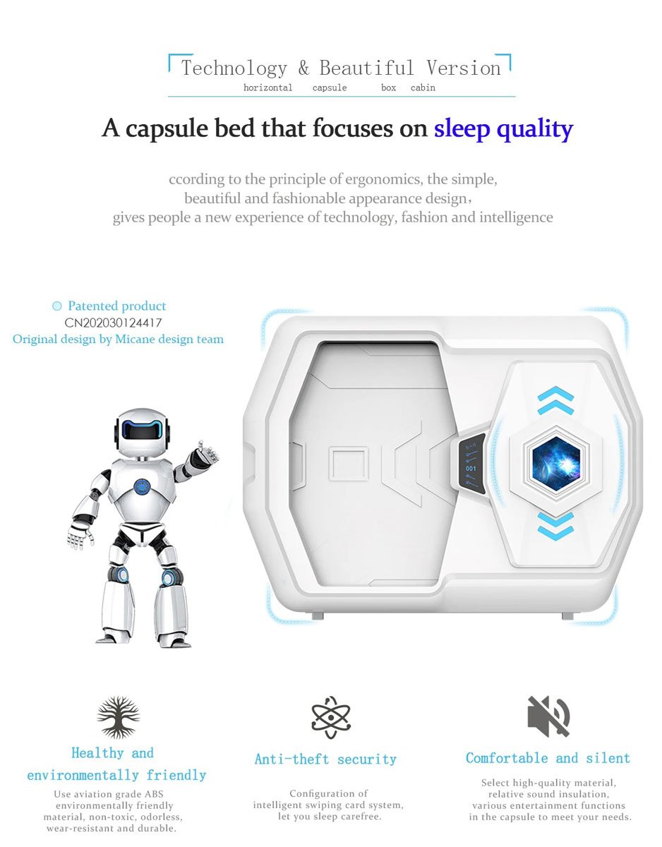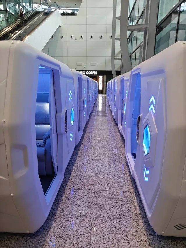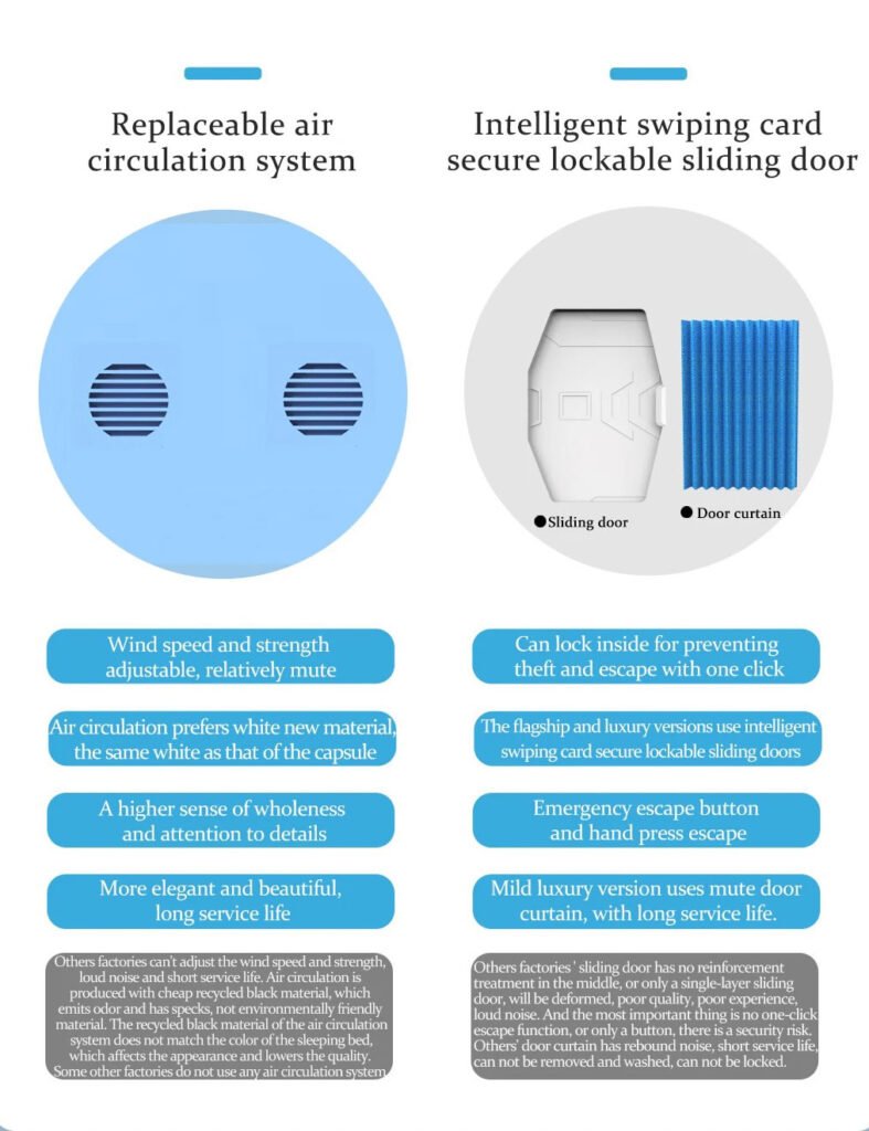 Security is a priority. Each pod features a steel sliding door with a smart card induction lock (hotel-style) or mechanical lock options. Inside, there is a private safe deposit box for valuables.